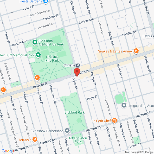 Parking: There is street parking along bloor street, and a Green P parking lot north of Bloor off of Clinton street, as well as 2 other lots north of Bloor off of Manning and Euclid.